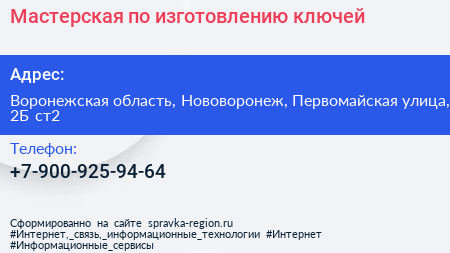 Мастерская по изготовлению ключей по адресу Воронежская область, Нововоронеж, Первомайская улица, 2Б ст2 в дальнейшем Организация, размещена в следующих категориях: