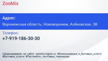 ZooMix по адресу Воронежская область, Нововоронеж, Алёновская, 38 в дальнейшем Организация, размещена в следующих категориях: