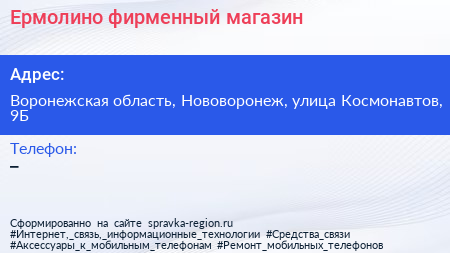 Ермолино, фирменный магазин по адресу Воронежская область, Нововоронеж, улица Космонавтов, 9Б в дальнейшем Организация, размещена в следующих категориях: