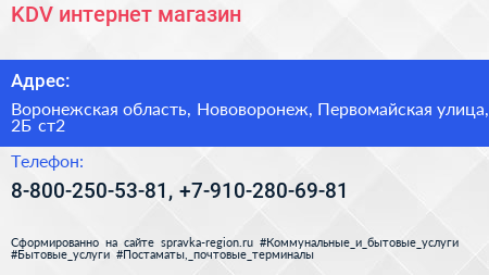 KDV, интернет-магазин по адресу Воронежская область, Нововоронеж, Первомайская улица, 2Б ст2 в дальнейшем Организация, размещена в следующих категориях: