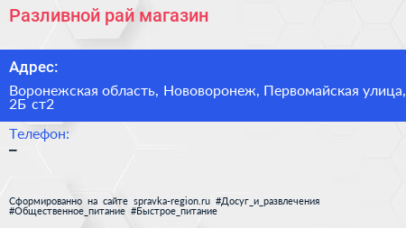 Разливной рай, магазин по адресу Воронежская область, Нововоронеж, Первомайская улица, 2Б ст2 в дальнейшем Организация, размещена в следующих категориях: