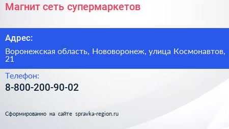 Магнит, сеть супермаркетов по адресу Воронежская область, Нововоронеж, улица Космонавтов, 21 в дальнейшем Организация, размещена в следующих категориях: