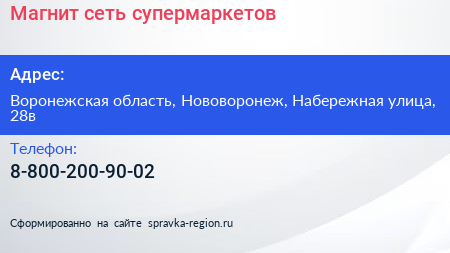 Магнит, сеть супермаркетов по адресу Воронежская область, Нововоронеж, Набережная улица, 28в в дальнейшем Организация, размещена в следующих категориях: