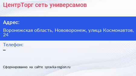 ЦентрТорг, сеть универсамов по адресу Воронежская область, Нововоронеж, улица Космонавтов, 24 в дальнейшем Организация, размещена в следующих категориях: