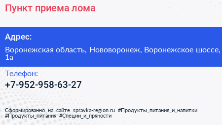 Пункт приема лома по адресу Воронежская область, Нововоронеж, Воронежское шоссе, 1а в дальнейшем Организация, размещена в следующих категориях: