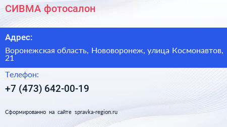 СИВМА, фотосалон по адресу Воронежская область, Нововоронеж, улица Космонавтов, 21 в дальнейшем Организация, размещена в следующих категориях: