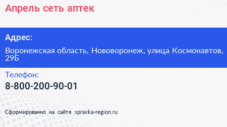 Апрель, сеть аптек по адресу Воронежская область, Нововоронеж, улица Космонавтов, 29Б в дальнейшем Организация, размещена в следующих категориях: