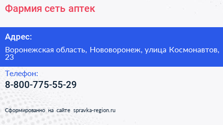 Фармия, сеть аптек по адресу Воронежская область, Нововоронеж, улица Космонавтов, 23 в дальнейшем Организация, размещена в следующих категориях: