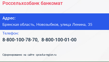Россельхозбанк, банкомат по адресу Брянская область, Новозыбков, улица Ленина, 35 в дальнейшем Организация, размещена в следующих категориях: