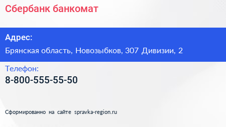 Сбербанк, банкомат по адресу Брянская область, Новозыбков, 307 Дивизии, 2 в дальнейшем Организация, размещена в следующих категориях: