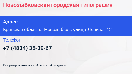 Новозыбковская городская типография по адресу Брянская область, Новозыбков, улица Ленина, 12 в дальнейшем Организация, размещена в следующих категориях: