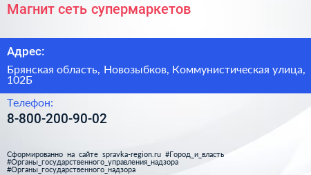 Магнит, сеть супермаркетов по адресу Брянская область, Новозыбков, Коммунистическая улица, 102Б в дальнейшем Организация, размещена в следующих категориях: