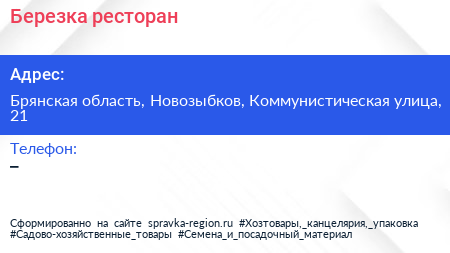 Березка, ресторан по адресу Брянская область, Новозыбков, Коммунистическая улица, 21 в дальнейшем Организация, размещена в следующих категориях: