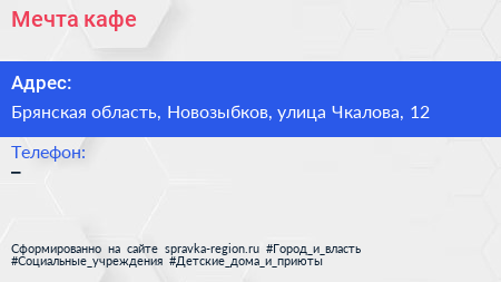 Мечта, кафе по адресу Брянская область, Новозыбков, улица Чкалова, 12 в дальнейшем Организация, размещена в следующих категориях: