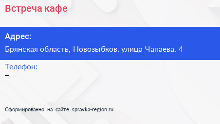 Встреча, кафе по адресу Брянская область, Новозыбков, улица Чапаева, 4 в дальнейшем Организация, размещена в следующих категориях: