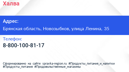 Халва по адресу Брянская область, Новозыбков, улица Ленина, 35 в дальнейшем Организация, размещена в следующих категориях: