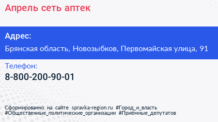 Апрель, сеть аптек по адресу Брянская область, Новозыбков, Первомайская улица, 91 в дальнейшем Организация, размещена в следующих категориях: