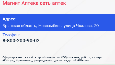 Магнит Аптека, сеть аптек по адресу Брянская область, Новозыбков, улица Чкалова, 20 в дальнейшем Организация, размещена в следующих категориях: