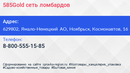 585Gold, сеть ломбардов по адресу 629802, Ямало-Ненецкий АО, Ноябрьск, Космонавтов, 16 в дальнейшем Организация, размещена в следующих категориях: