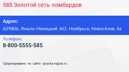 585*Золотой, сеть ломбардов по адресу 629806, Ямало-Ненецкий АО, Ноябрьск, Новосёлов, 6а в дальнейшем Организация, размещена в следующих категориях: