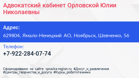 Адвокатский кабинет Орловской Юлии Николаевны по адресу 629804, Ямало-Ненецкий АО, Ноябрьск, Шевченко, 56 в дальнейшем Организация, размещена в следующих категориях: