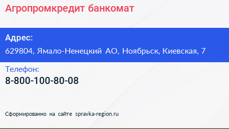 Агропромкредит, банкомат по адресу 629804, Ямало-Ненецкий АО, Ноябрьск, Киевская, 7 в дальнейшем Организация, размещена в следующих категориях: