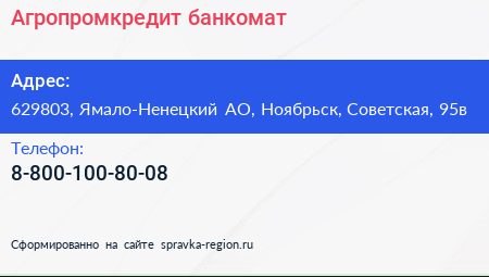 Агропромкредит, банкомат по адресу 629803, Ямало-Ненецкий АО, Ноябрьск, Советская, 95в в дальнейшем Организация, размещена в следующих категориях: