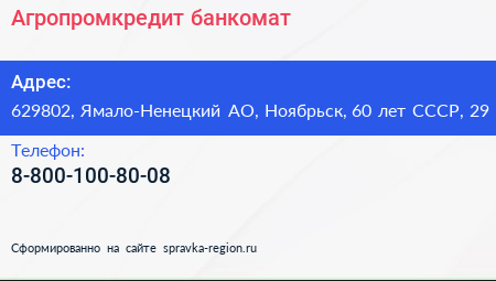 Агропромкредит, банкомат по адресу 629802, Ямало-Ненецкий АО, Ноябрьск, 60 лет СССР, 29 в дальнейшем Организация, размещена в следующих категориях: