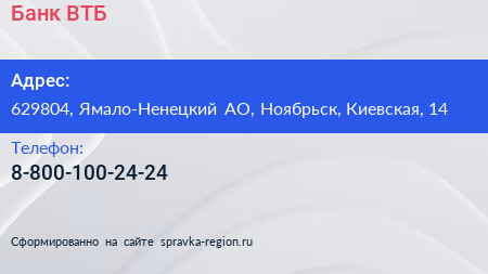 Банк ВТБ по адресу 629804, Ямало-Ненецкий АО, Ноябрьск, Киевская, 14 в дальнейшем Организация, размещена в следующих категориях: