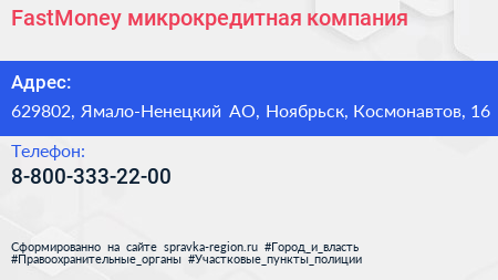 FastMoney, микрокредитная компания по адресу 629802, Ямало-Ненецкий АО, Ноябрьск, Космонавтов, 16 в дальнейшем Организация, размещена в следующих категориях: