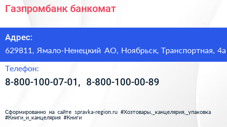 Газпромбанк, банкомат по адресу 629811, Ямало-Ненецкий АО, Ноябрьск, Транспортная, 4а в дальнейшем Организация, размещена в следующих категориях: