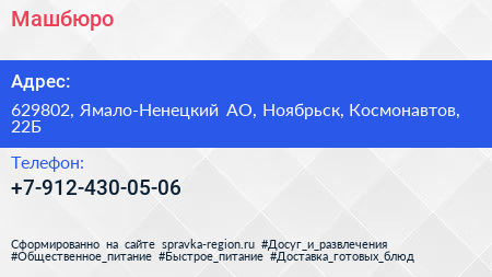 Машбюро по адресу 629802, Ямало-Ненецкий АО, Ноябрьск, Космонавтов, 22Б в дальнейшем Организация, размещена в следующих категориях:
