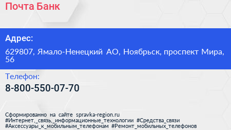 Почта Банк по адресу 629807, Ямало-Ненецкий АО, Ноябрьск, проспект Мира, 56 в дальнейшем Организация, размещена в следующих категориях: