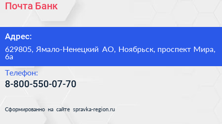Почта Банк по адресу 629805, Ямало-Ненецкий АО, Ноябрьск, проспект Мира, 6а в дальнейшем Организация, размещена в следующих категориях: