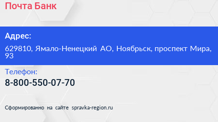 Почта Банк по адресу 629810, Ямало-Ненецкий АО, Ноябрьск, проспект Мира, 93 в дальнейшем Организация, размещена в следующих категориях: