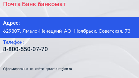 Почта Банк, банкомат по адресу 629807, Ямало-Ненецкий АО, Ноябрьск, Советская, 73 в дальнейшем Организация, размещена в следующих категориях: