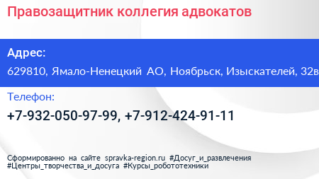 Правозащитник, коллегия адвокатов по адресу 629810, Ямало-Ненецкий АО, Ноябрьск, Изыскателей, 32в в дальнейшем Организация, размещена в следующих категориях: