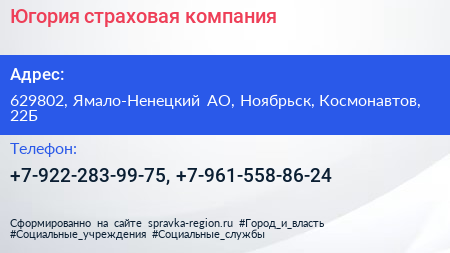 Югория, страховая компания по адресу 629802, Ямало-Ненецкий АО, Ноябрьск, Космонавтов, 22Б в дальнейшем Организация, размещена в следующих категориях: