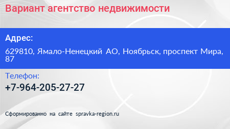 Вариант, агентство недвижимости по адресу 629810, Ямало-Ненецкий АО, Ноябрьск, проспект Мира, 87 в дальнейшем Организация, размещена в следующих категориях: