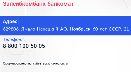 Запсибкомбанк, банкомат по адресу 629806, Ямало-Ненецкий АО, Ноябрьск, 60 лет СССР, 21 в дальнейшем Организация, размещена в следующих категориях: