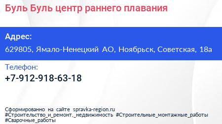 Буль-Буль, центр раннего плавания по адресу 629805, Ямало-Ненецкий АО, Ноябрьск, Советская, 18а в дальнейшем Организация, размещена в следующих категориях: