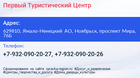 Первый Туристический Центр по адресу 629810, Ямало-Ненецкий АО, Ноябрьск, проспект Мира, 76Б в дальнейшем Организация, размещена в следующих категориях: