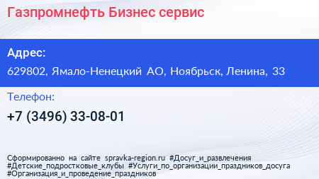 Газпромнефть-Бизнес сервис по адресу 629802, Ямало-Ненецкий АО, Ноябрьск, Ленина, 33 в дальнейшем Организация, размещена в следующих категориях: