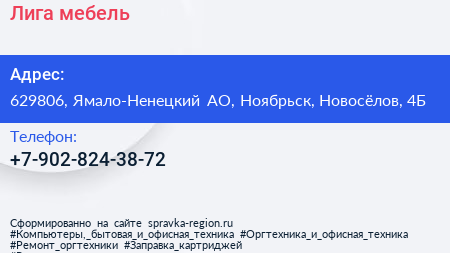 Лига-мебель по адресу 629806, Ямало-Ненецкий АО, Ноябрьск, Новосёлов, 4Б в дальнейшем Организация, размещена в следующих категориях: