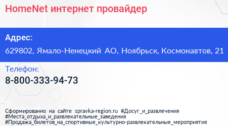 HomeNet, интернет-провайдер по адресу 629802, Ямало-Ненецкий АО, Ноябрьск, Космонавтов, 21 в дальнейшем Организация, размещена в следующих категориях: