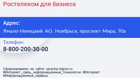 Ростелеком для бизнеса по адресу Ямало-Ненецкий АО, Ноябрьск, проспект Мира, 70а в дальнейшем Организация, размещена в следующих категориях: