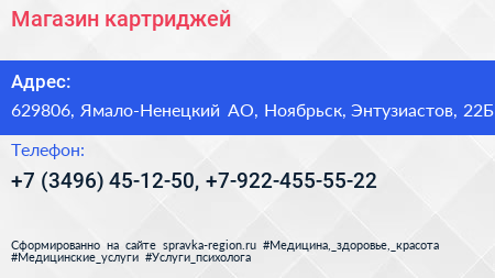 Магазин картриджей по адресу 629806, Ямало-Ненецкий АО, Ноябрьск, Энтузиастов, 22Б в дальнейшем Организация, размещена в следующих категориях: