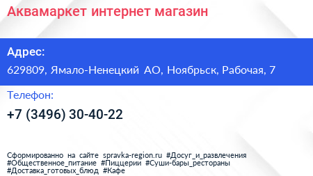 Аквамаркет, интернет-магазин по адресу 629809, Ямало-Ненецкий АО, Ноябрьск, Рабочая, 7 в дальнейшем Организация, размещена в следующих категориях: