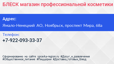 БЛЕСК, магазин профессиональной косметики по адресу Ямало-Ненецкий АО, Ноябрьск, проспект Мира, 68а в дальнейшем Организация, размещена в следующих категориях: