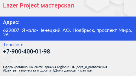 Lazer Project, мастерская по адресу 629807, Ямало-Ненецкий АО, Ноябрьск, проспект Мира, 26 в дальнейшем Организация, размещена в следующих категориях: